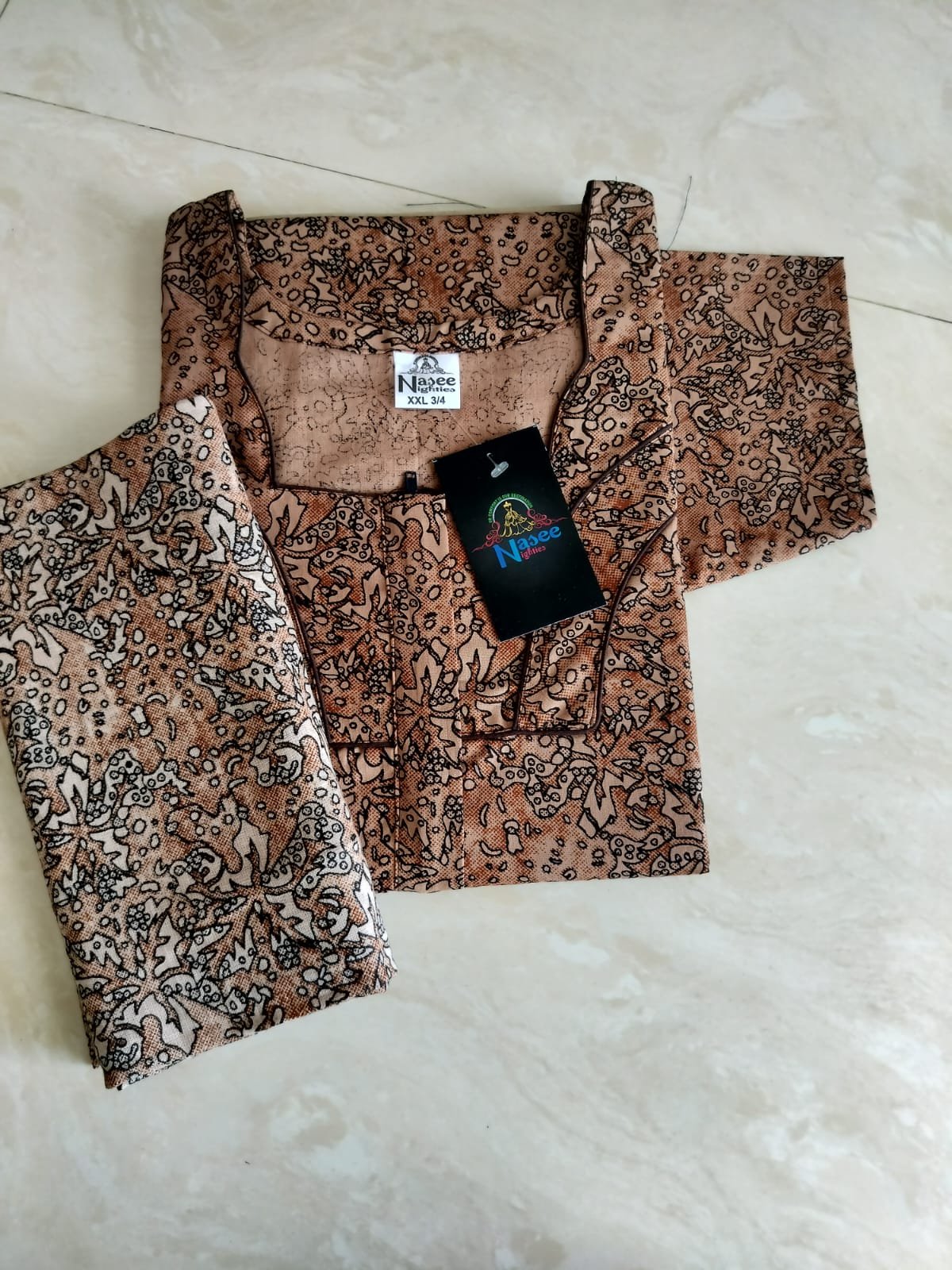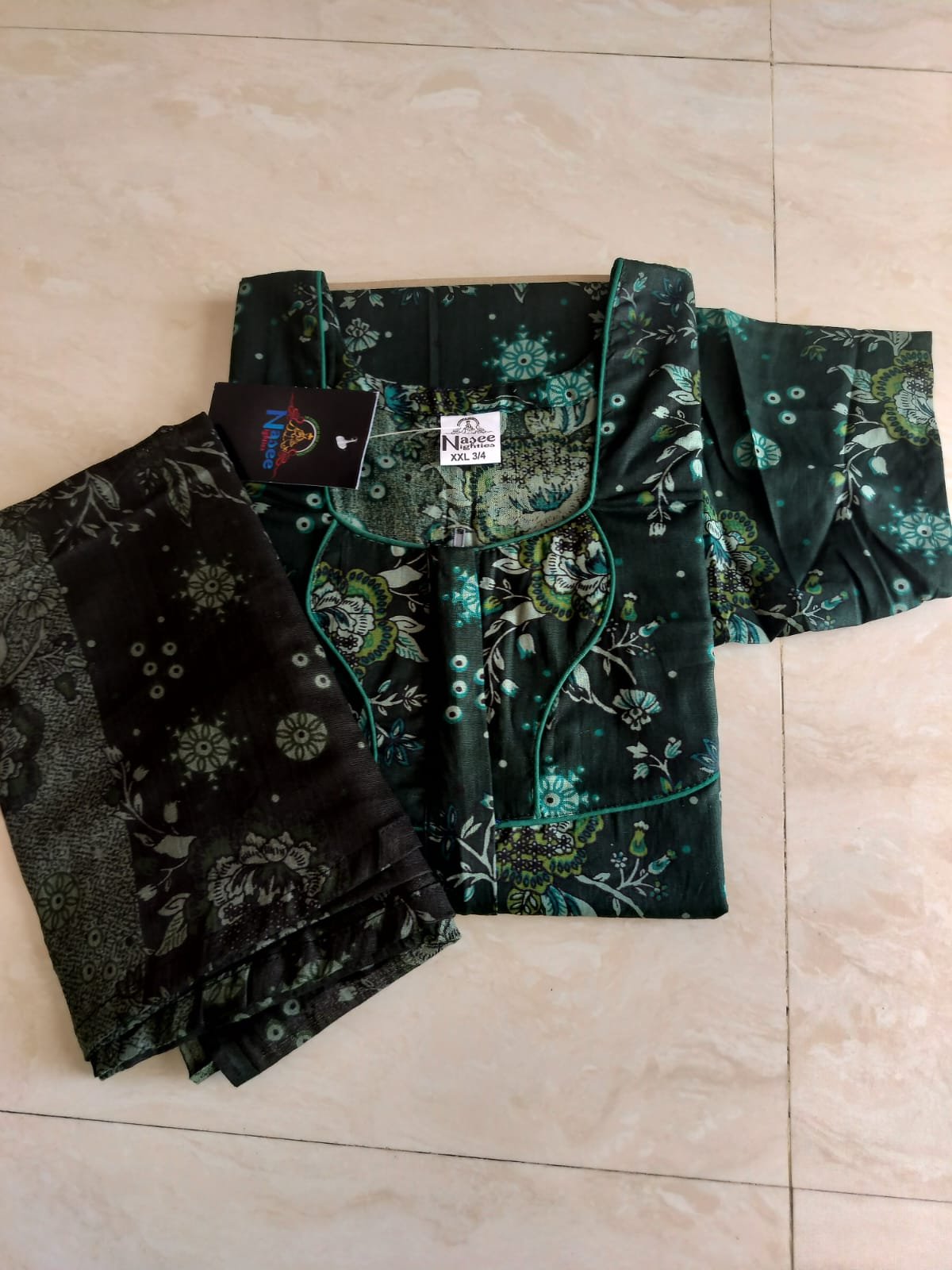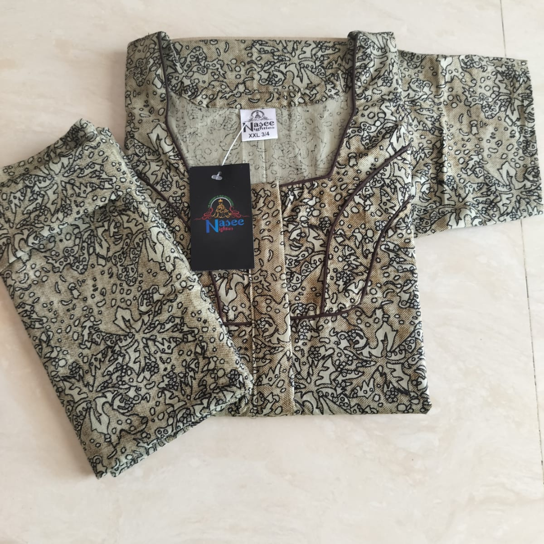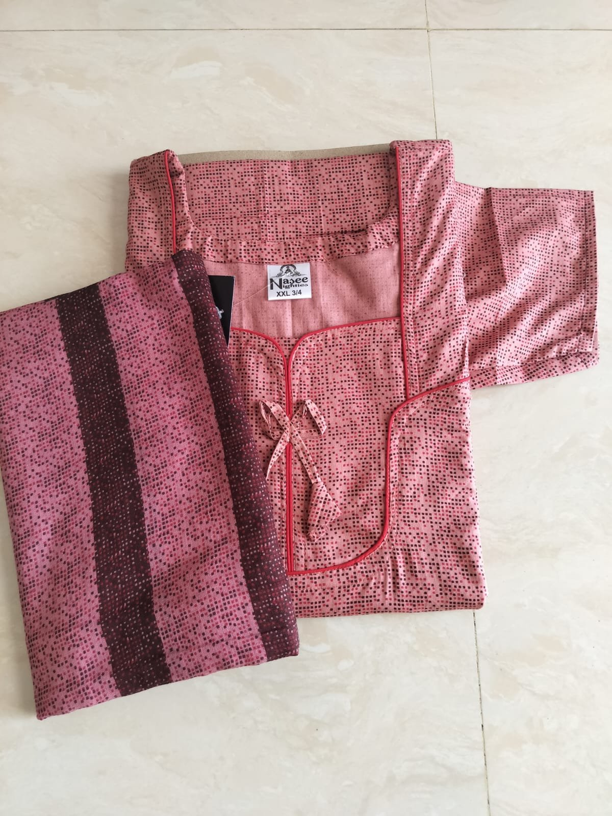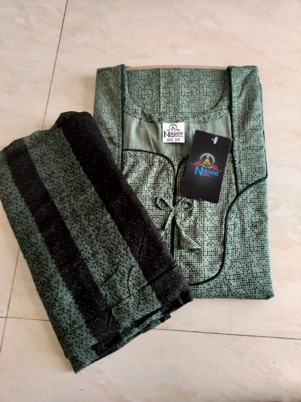 This 3/4 sleeve nighty with a matching dupatta offers a perfect blend of comfort and traditional elegance. Crafted from soft, breathable fabric, it drapes gently for a relaxed and airy feel. The 3/4 sleeves add ease and flexibility, while the dupatta gives it a modest, graceful finish. Ideal for women who prefer stylish yet comfortable nightwear for everyday use.